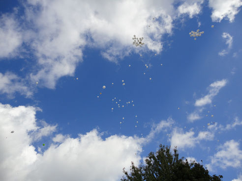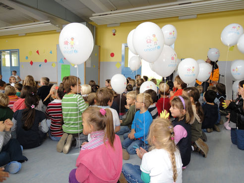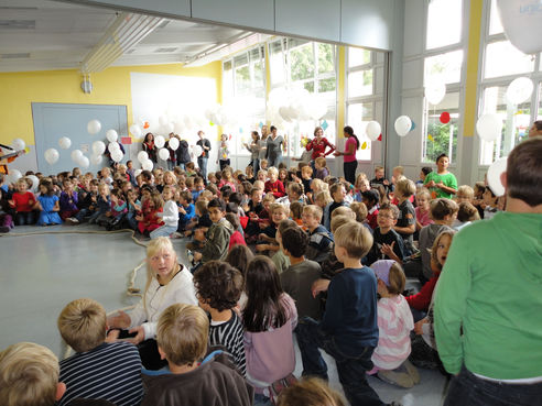 Jeder hat sich ein Thema vorgenommen und es auf eine selbstgemalte Hand geschrieben. Diese Hände haben wir dann an Luftballons gehängt. Mit den Luftballons gingen alle Kinder in die Turnhalle, wo die Klassen ihre erarbeiteten Sachen zu den Kinderrechten vorstellten. Zur Freude aller Kinder gingen wir auf eine große Wiese und ließen die Kinderrechte-Luftballons in den Himmel steigen. Alle Leute sollen wissen wovor Kinder Schutz brauchen und ihnen helfen.