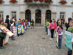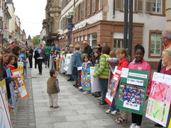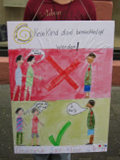 Mit großen Plakaten und einer "Kinderrechtestraße" machten Schüler der Landauer Grundschulen auf die Kinderrechte aufmerksam. Von jeder Grundschule durften pro Klassenstufe 2 Abgeordnete ihre Schule vertreten. Die Kinder an unserer Schule wählten die Abgeordneten für diese Aktion aus, was nicht gerade einfach war, da die meisten gerne mitgegangen wären. Die "Zurückgebliebenen" verabschiedeten die Abgeordneten mit einem Lied und beschäftigten sich in der Schule mit den dort ausgehängten Plakaten und konnten sich intensiv im Rahmen unseres Demokratietages mit dem Motto des Kinderrechtetages auseinandersetzen.