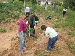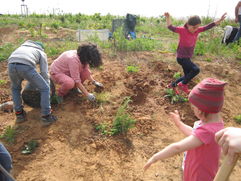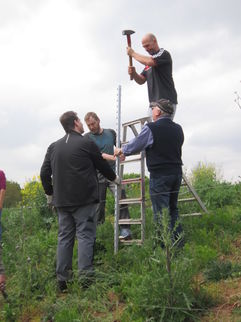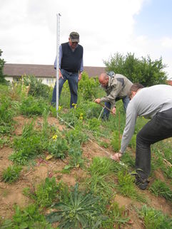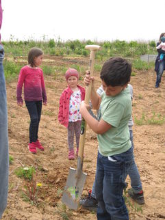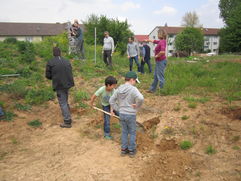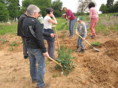Am Freitag, den 5.5.2017 war es dann soweit. Unsere Mitarbeiterin organisierte zusammen mit ihrem Vater die Materialien, der Förderverein sorgte für Kaffee und Kekse. Bei schönstem Wetter kamen 15 Erwachsene und 4 Kinder. Das Ziel des Einsatzes war es, den Weinberg so vorzubereiten, damit die Kinder die Reben pflanzen können. Es wurden Wildpflanzen versetzt, „ Stickel“ eingeschlagen und Drähte gespannt. Die Kinder hatten viel Spaß, Löcher zu graben und zu wässern. Beim Arbeiten wurden schon viele Fragen zum Weinbau gestellt und es wurde viel gelacht.